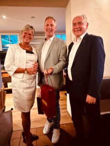 Festlich gekleidet ging es am Samstagabend zum Dinner, bei dem nicht nur nette Grußworte, sondern auch Gastgeschenke ausgetauscht wurden. Im Gegenzug für fränkischen Wein in den typischen Boxbeutelflaschen und einen Fotoband aus Würzburg erhielt der Hochheim-Flörsheimer Lions-Präsident Jens Haala (mitte) ein französisches Weinpräsent von seiner Amtskollegin Corinne Mailly (links), die der Past-Präsident aus Charenton-le-Pont Rodolphe Rousseing (rechts) ins Deutsche übersetzend bei der Kommunikation unterstützte.